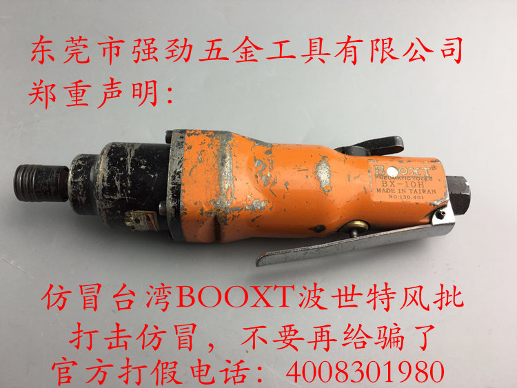 我司旗下BOOXT品牌BX-10H氣動螺絲刀風(fēng)批上市十多年,品質(zhì)一直很穩(wěn)定,在市場上已經(jīng)積累了不少粉絲。而最近,我司做售后維修時發(fā)現(xiàn),有些看起很“真”的BX-10H看起來用了沒多久,卻要維修了,而且客戶明言保修。經(jīng)過簽定才發(fā)現(xiàn),這不過是李鬼而已,品牌標識、烤漆、機身防偽、工藝等明面上的信息已經(jīng)深深出賣了它。李鬼,對于終端使用者來講,有時確實很難辨認。而所購買的氣動螺絲刀風(fēng)批是否為正品?能否保證工具品質(zhì),這個已經(jīng)嚴重影響了生產(chǎn)秩序。