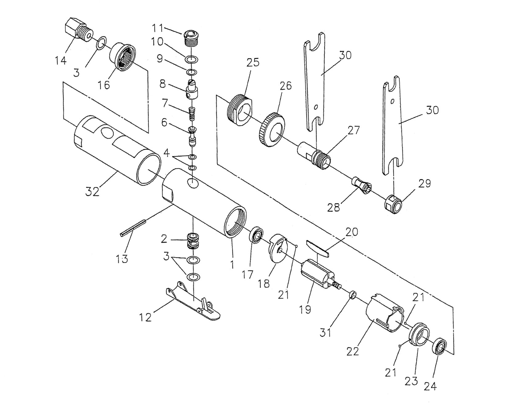 氣動刻磨機更換配件很簡單,以BOOXT BX-200A氣動刻磨機為例,參照以下分解圖: