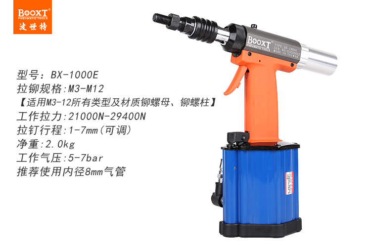 東莞市強勁五金工具有限公司提供BOOXT波世特品牌氣動工具,全自動拉帽槍BX-1000E廠家直銷,首件享特價。咨詢熱線:4008301980