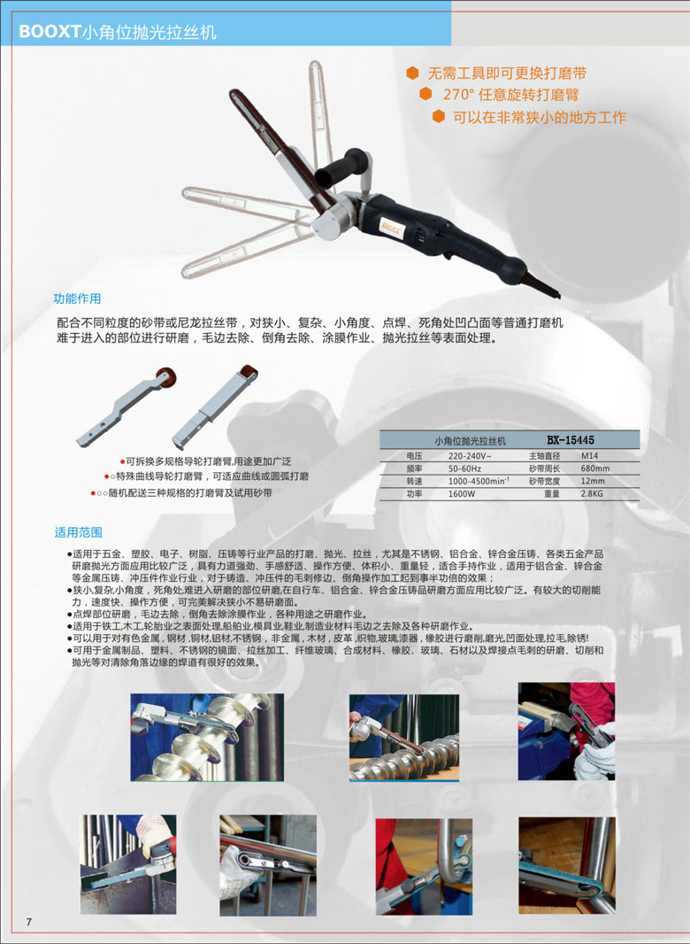2)適用于五金、塑膠、電子、樹脂、各種壓鑄、不銹鋼等行業(yè)的打磨、拋光、拉絲、去毛刺、倒角等作業(yè)。