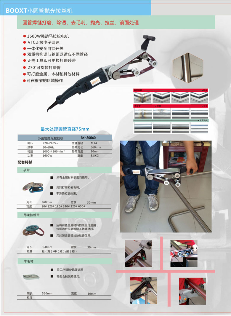 • 產(chǎn)品用途: 圓管焊縫打磨、除銹、去毛刺、拋光、拉絲、鏡面處理。