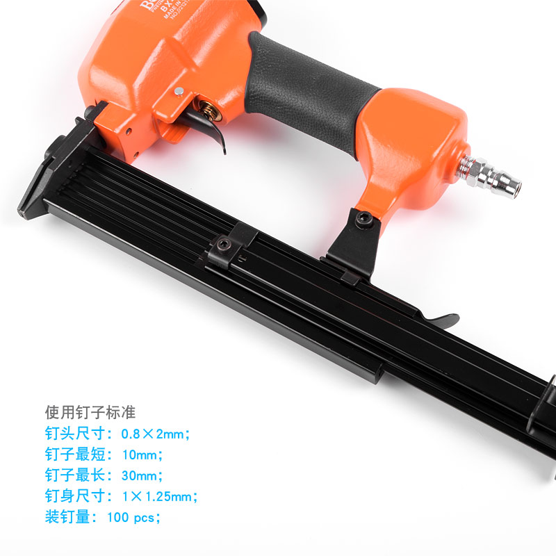 • 產(chǎn)品參數(shù): 釘腳尺寸:1×1.25mm;使用釘子長度范圍:10-30mm;裝釘量:100個;重量:1.2kg;使用工作氣壓:0.6Mpa;推薦使用內(nèi)徑6.5mm氣管;平時多注意定時排放空壓機水份