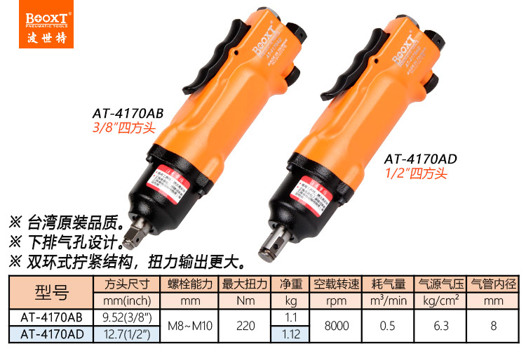 東莞市強勁五金工具有限公司提供臺灣BOOXT波世特品牌氣動工具,直式風扳手AT-4170AD廠家直銷,首件享特價。咨詢熱線:4008301980