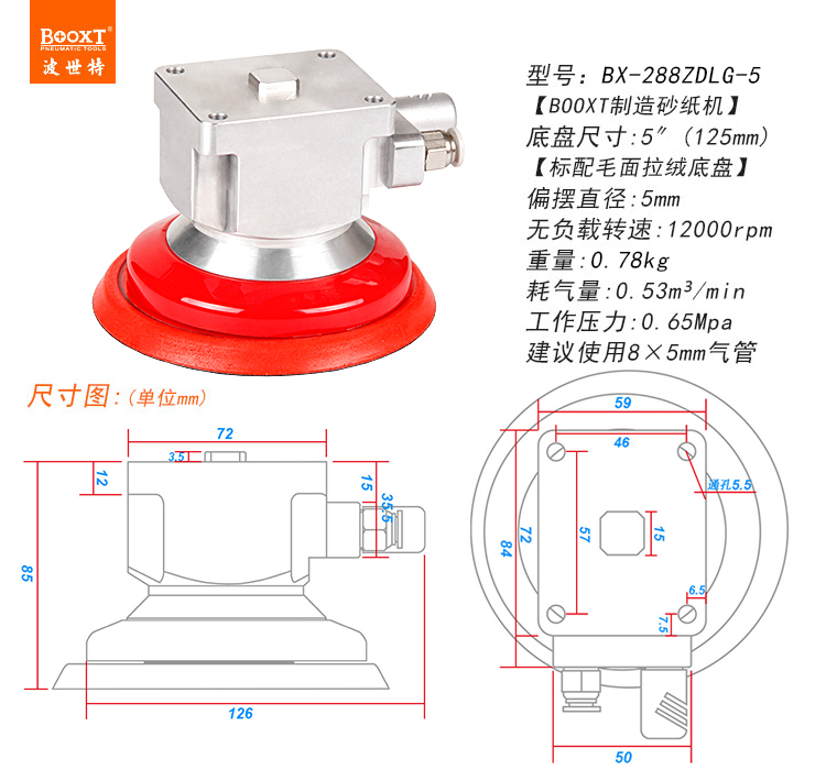 • 產(chǎn)品參數(shù): 底盤尺寸:125mm 偏心尺寸:5mm (中磨) 空載轉(zhuǎn)速:12000rpm 重 量:0.78kg 耗 氣 量:0.53立方米/分鐘