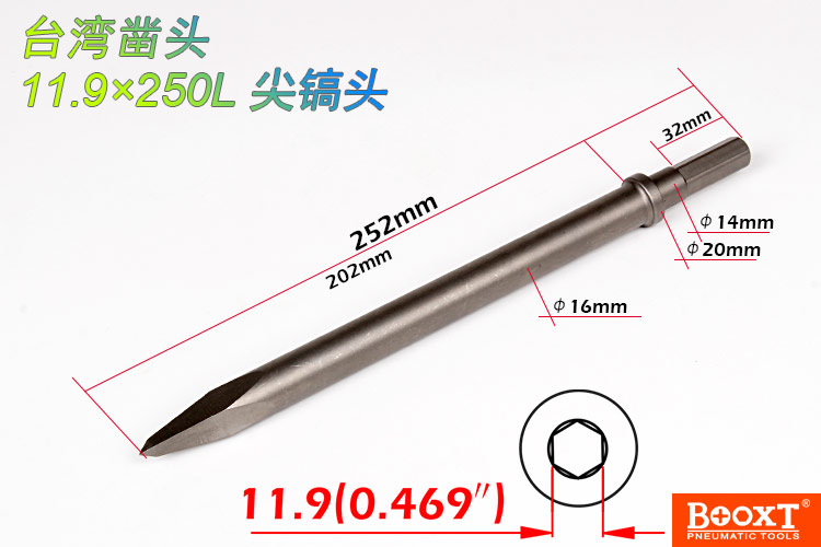 • 產(chǎn)品參數(shù): 鎬尖尺寸:H11.9*250L*20W 【標(biāo)配/扁鎬頭】 活塞直徑:20*48mm 活塞沖程:58mm 打 擊 數(shù):3000bpm 帶鎬全長:475mm 含鎬重量:2.16kg (含鎬頭) 耗 氣 量:7.4cfm 【六角柄】
