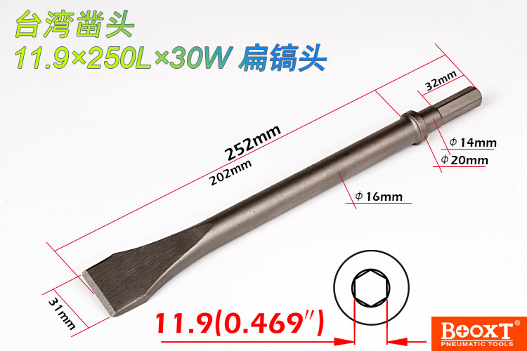 鎬尖尺寸:H11.9*250L*20W   【標(biāo)配/扁鎬頭】