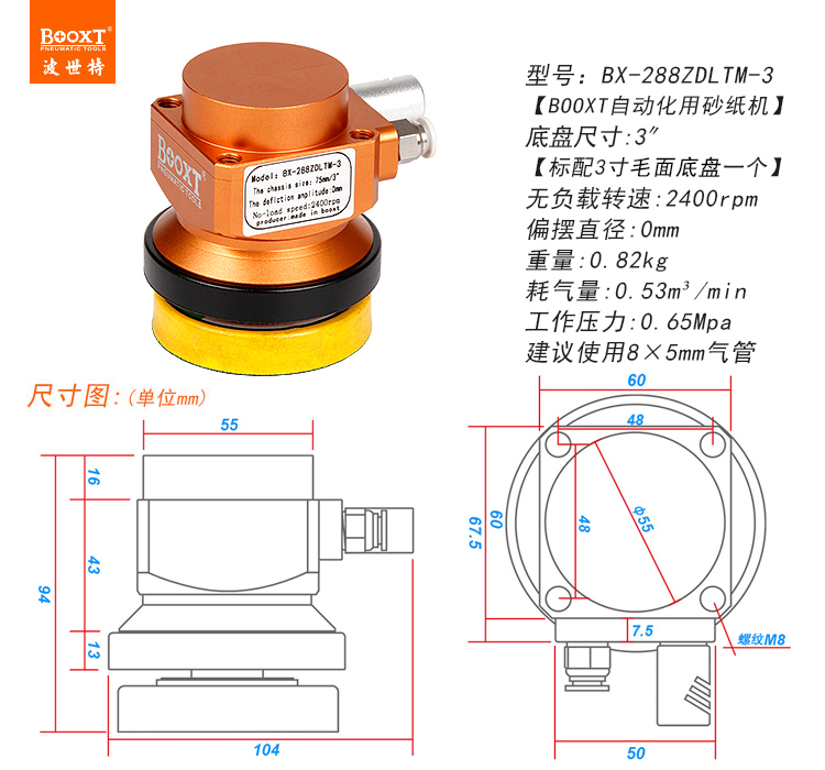 • 產(chǎn)品參數(shù): 底盤尺寸:75mm (3寸) 偏擺直徑:0mm (同心/無偏擺) 空載轉(zhuǎn)速:2400rpm 重 量:0.82KG 耗 氣 量:0.53m3/min 【同心/慢速】