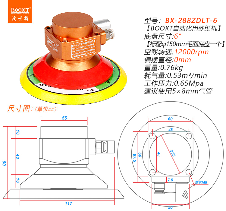 • 產(chǎn)品參數(shù): 底盤尺寸:150mm 【6寸】 偏心尺寸:0mm (同心) 空載轉(zhuǎn)速:2400rpm 重 量:0.76kg 耗 氣 量:0.53m3/min 【同心/高速】