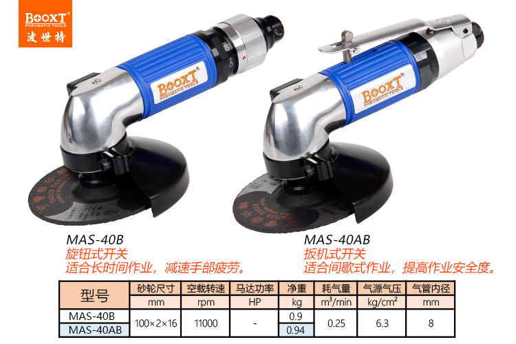 東莞市強勁五金工具有限公司提供臺灣BOOXT波世特品牌氣動工具,輕型風動角磨機MAS-40AB廠家直銷,首件享特價。咨詢熱線:4008301980