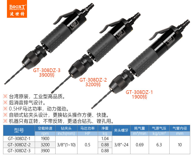 東莞市強(qiáng)勁五金工具有限公司提供臺(tái)灣BOOXT波世特品牌氣動(dòng)工具,自鎖夾頭氣鉆GT-308DZ-1廠家直銷,首件享特價(jià)。咨詢熱線:4008301980