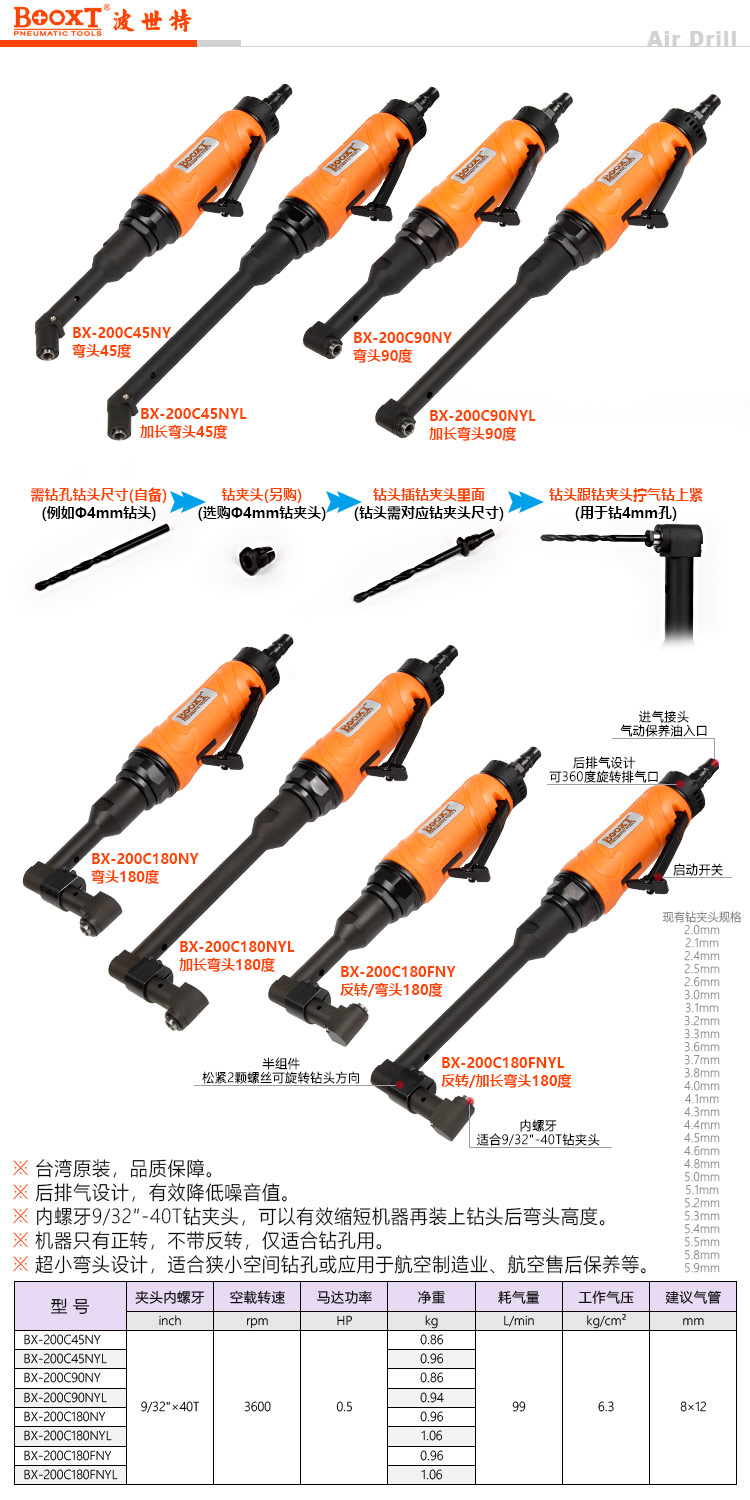 東莞市強勁五金工具有限公司提供臺灣BOOXT波世特品牌氣動工具,加長45度偏角氣鉆BX-200C45NYL廠家直銷,首件享特價。咨詢熱線:4008301980