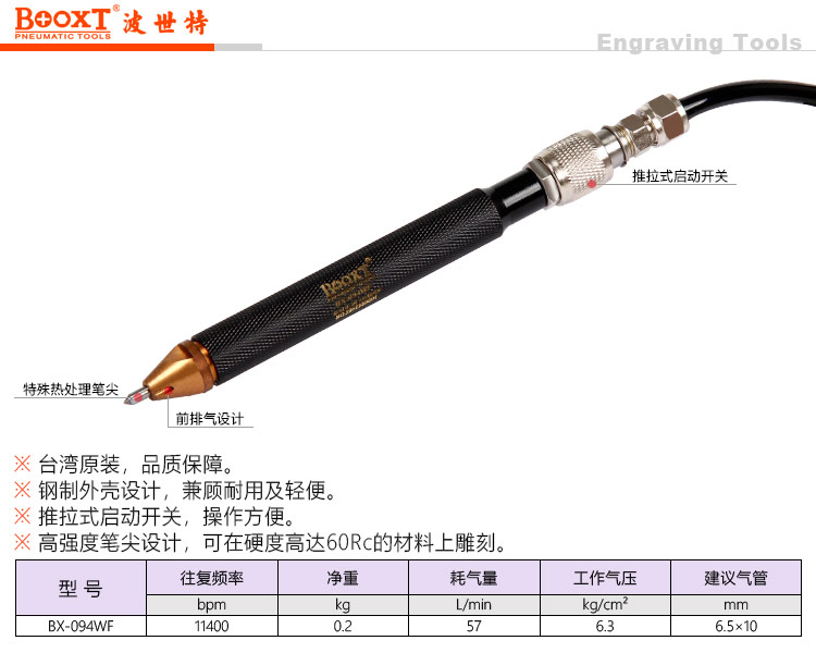 東莞市強勁五金工具有限公司提供臺灣BOOXT波世特品牌氣動工具,風(fēng)動刻字筆BX-094WF廠家直銷,首件享特價。咨詢熱線:4008301980