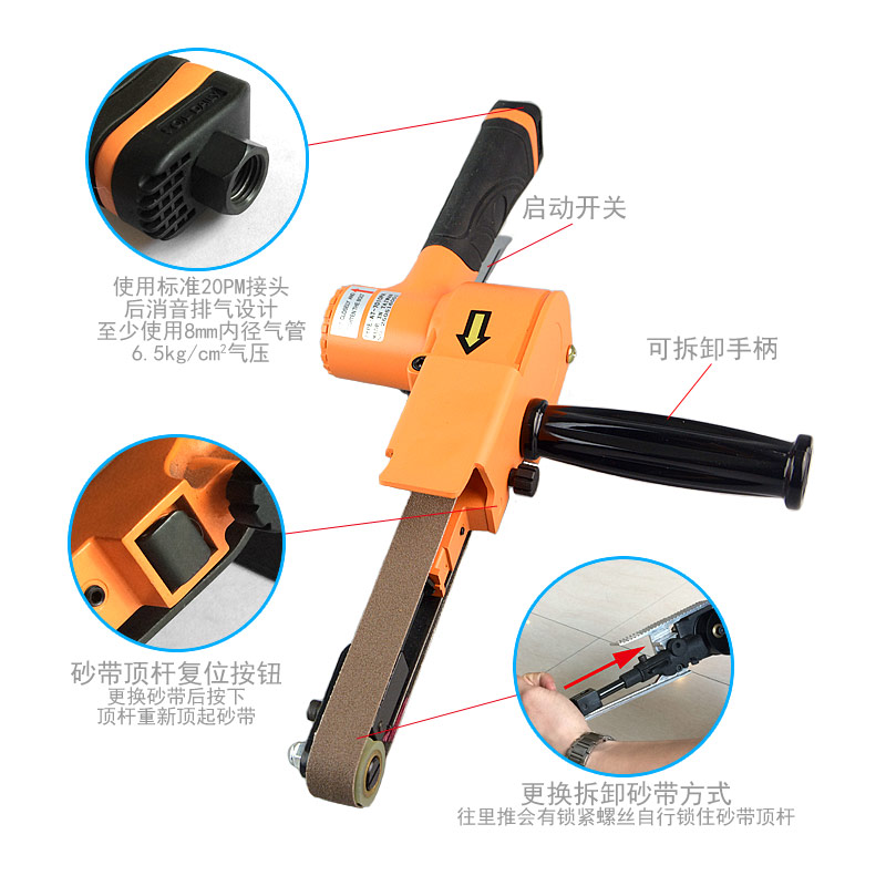 • 產(chǎn)品參數(shù): 砂帶尺寸:20×520mm; 空載轉(zhuǎn)速:17000rpm; 工具長度:406mm; 工具重量:1.32kg; 馬達功率:0.5HP; 耗 氣 量:0.4立方米/分鐘; 使用工作氣壓:0.65Mpa; 推薦使用內(nèi)徑8mm氣管; 平時使用應多加氣動油保養(yǎng)