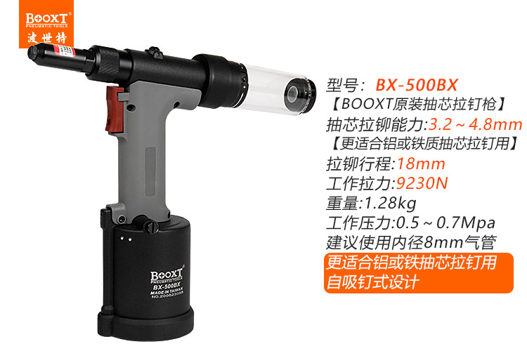 東莞市強勁五金工具有限公司提供臺灣BOOXT波世特品牌氣動工具,自吸氣動拉鉚槍BX-500BX廠家直銷,首件享特價。咨詢熱線:4008301980