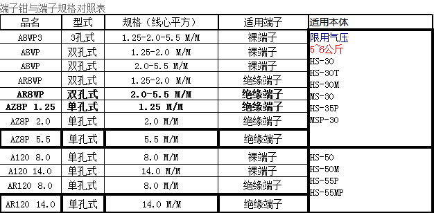 端子鉗與端子規(guī)格對照表:
