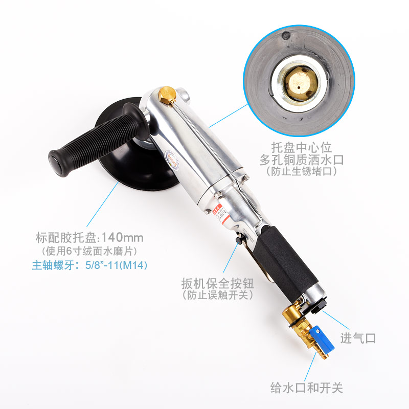 • 產(chǎn)品參數(shù): 托盤尺寸:140mm(M14螺牙);使用磨片:140mm或150mm;轉(zhuǎn)速:7000rpm;長度:430mm;重量:3.2kg;功率:0.93hp;耗氣量:1.15立方米/分鐘;使用工作氣壓:0.63Mpa;推薦氣管內(nèi)徑13mm;平時使用應(yīng)多加氣動油保養(yǎng)